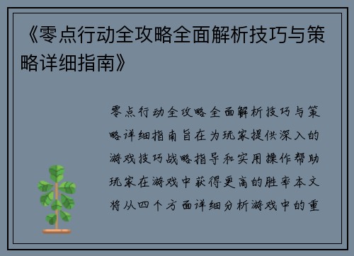 《零点行动全攻略全面解析技巧与策略详细指南》旨在为玩家提供深入的游戏技巧、战略指导和实用操作,帮助玩家在游戏中获得更高的胜率。本文将从四个方面详细分析游戏中的重要元素,包括角色选择与技能搭配、地图分析与战略布局、团队配合与战术执行,以及个人技术提升与心态管理。每个部分都会详细阐述相关的技巧与策略,旨在帮助玩家全面提升自己的游戏水平。无论是新手玩家还是资深高手,都能从本篇攻略中找到有价值的内容,提升游戏体验,最终在《零点行动》中取得更多的胜利。
